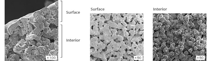 Solidified milk powder, cross-sections and surface via electron microscopy