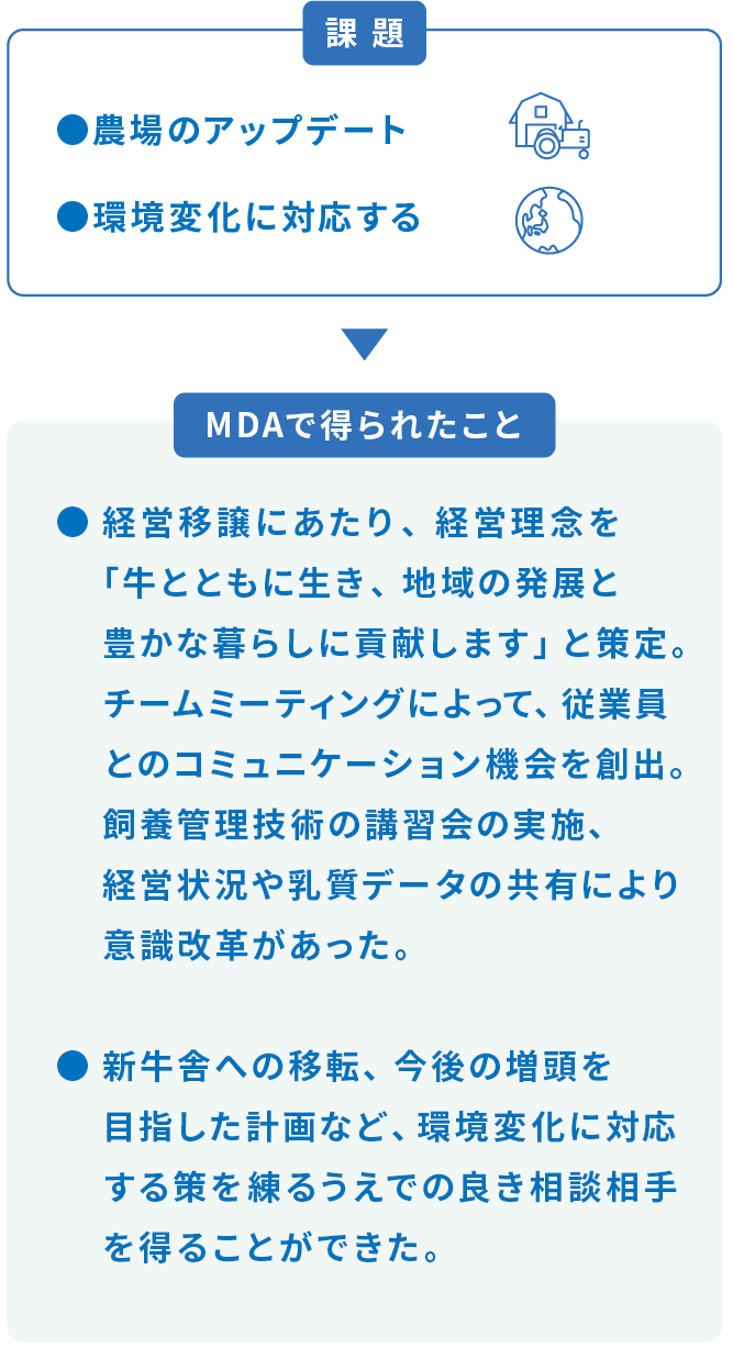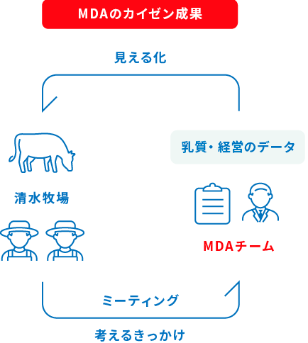 原因を探るには、牛の様子を観察するだけでなく、専門的な知識も必要になりますが、その伝え方には難しさを感じているといいます。「昔の酪農家は先人の背中を見て仕事を覚えるものだったかもしれませんが、今は違います。相手の知識に合ったレベルで因果関係を教えることで、解決策を自分で探せる力をスタッフにも養っていってもらいたいと考えています」と清水さん。明治飼糧と明治アニマルヘルス、明治の担当者が牛や飼料の状態、従業員の作業状況を確認し、問題点や改善策を示すことで、明治グループとして連携した支援を行っています。