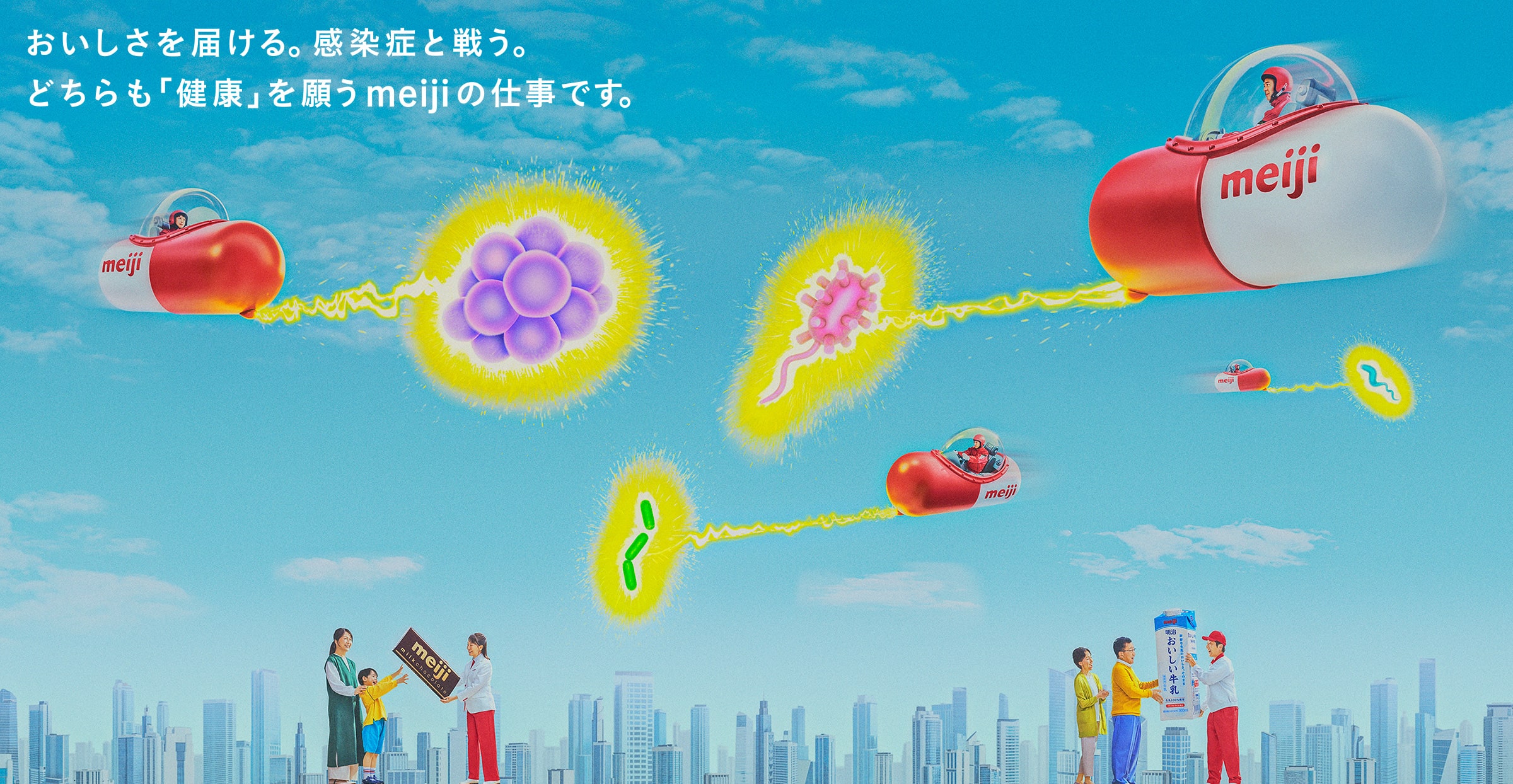 この先、急速な環境変化にともなって、これまでの薬が効かなかったり、未知の病が現れるかもしれない。おいしさを届けるだけではなく、未知の感染症と戦うことも「すべての人を健康に」と願う私たちmeijiの仕事です。