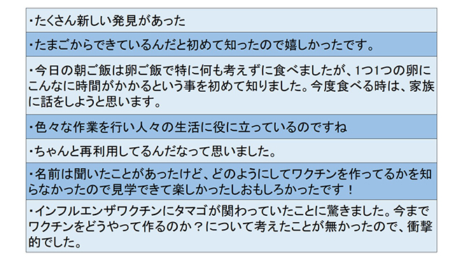 今回のオンライン工場見学もその一環として、子どもたちにオンラインでインフルエンザワクチンの原液をつくる工場を見学してもらいました。子どもたちがわかりやすく楽しみながら学習できるよう、ウイルスやワクチンに関するクイズを交えながら行いました。参加した約40人の子どもたちから、たくさんのお礼や感想が届きました。